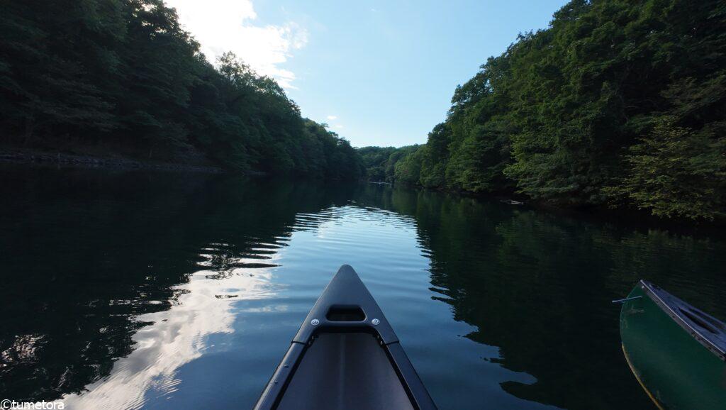 カヌーに乗り込み、ゆっくりと湖面へ漕ぎ出しました。