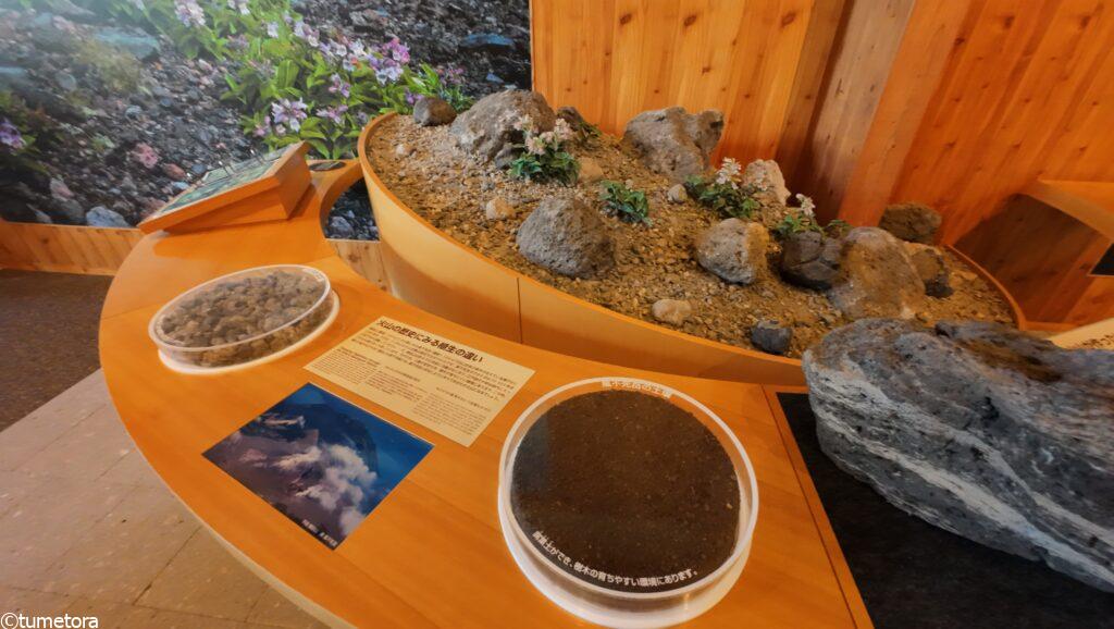 活火山である樽前山の厳しい気象条件に適応した高山植物や、特殊な火山岩に関する紹介コーナーもあります。