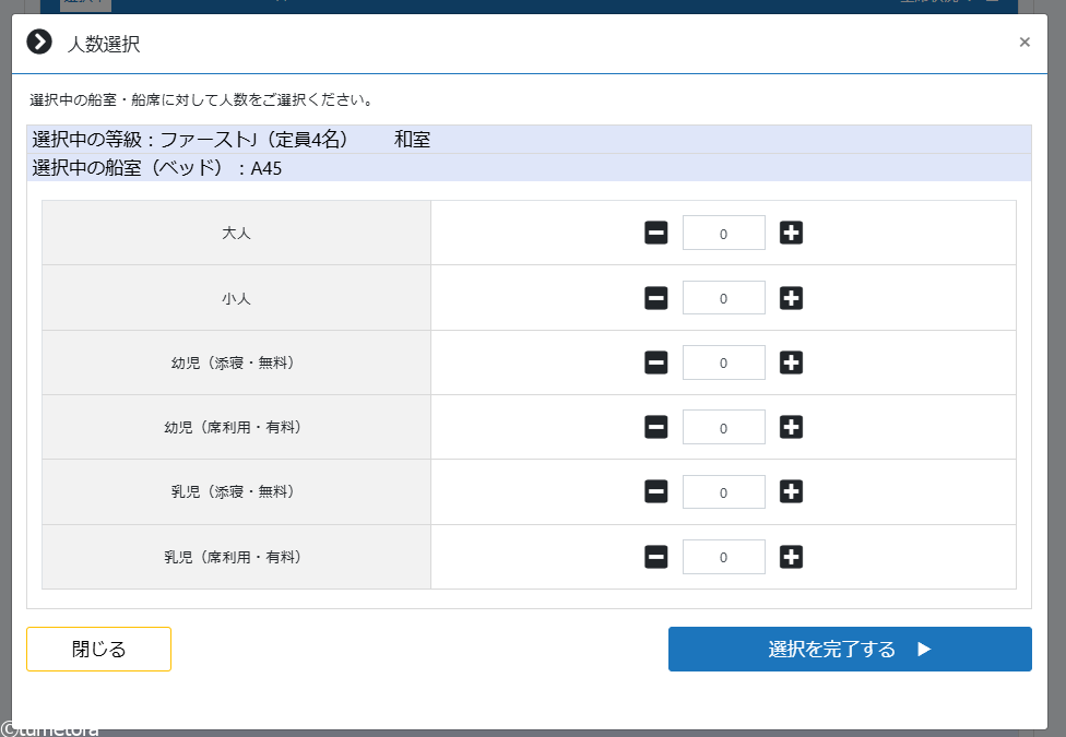 船室選択後に、乗船人数を入力してください。