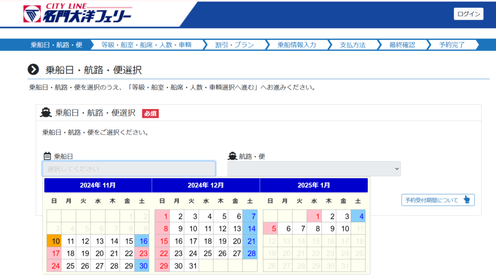 乗船日・航路・便選択|名門大洋フェリー
