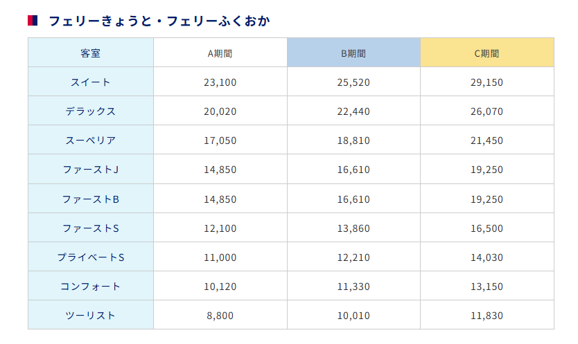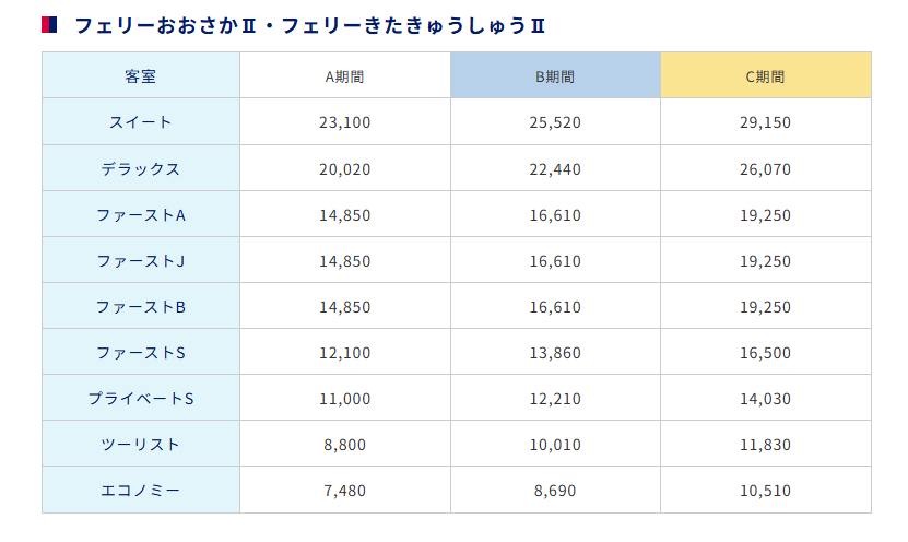 航路により船室も異なりフェリーごとにA期間、B期間、C期間と3種類あります。