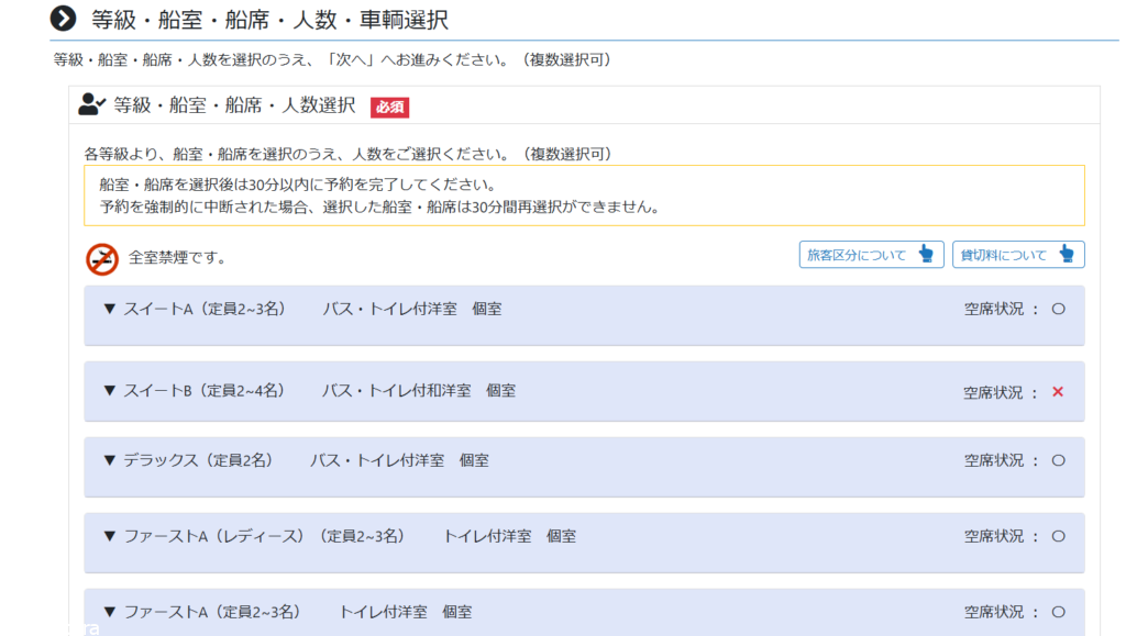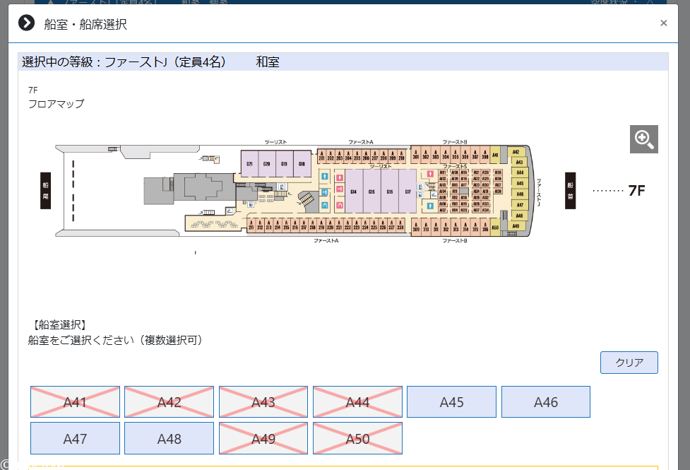 希望する等級を選択すると船内マップと空室が表示されるので×が付いていない部屋を選択してください。