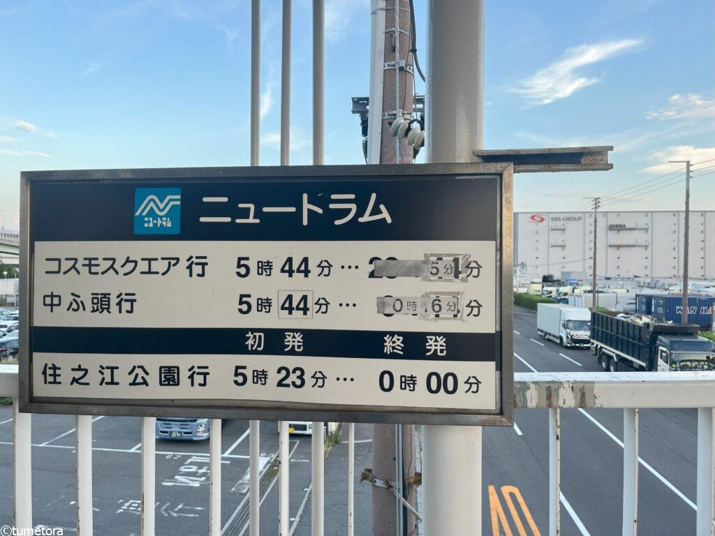 連絡通路にニュートラムの初発と終発の時刻の表示もあります。